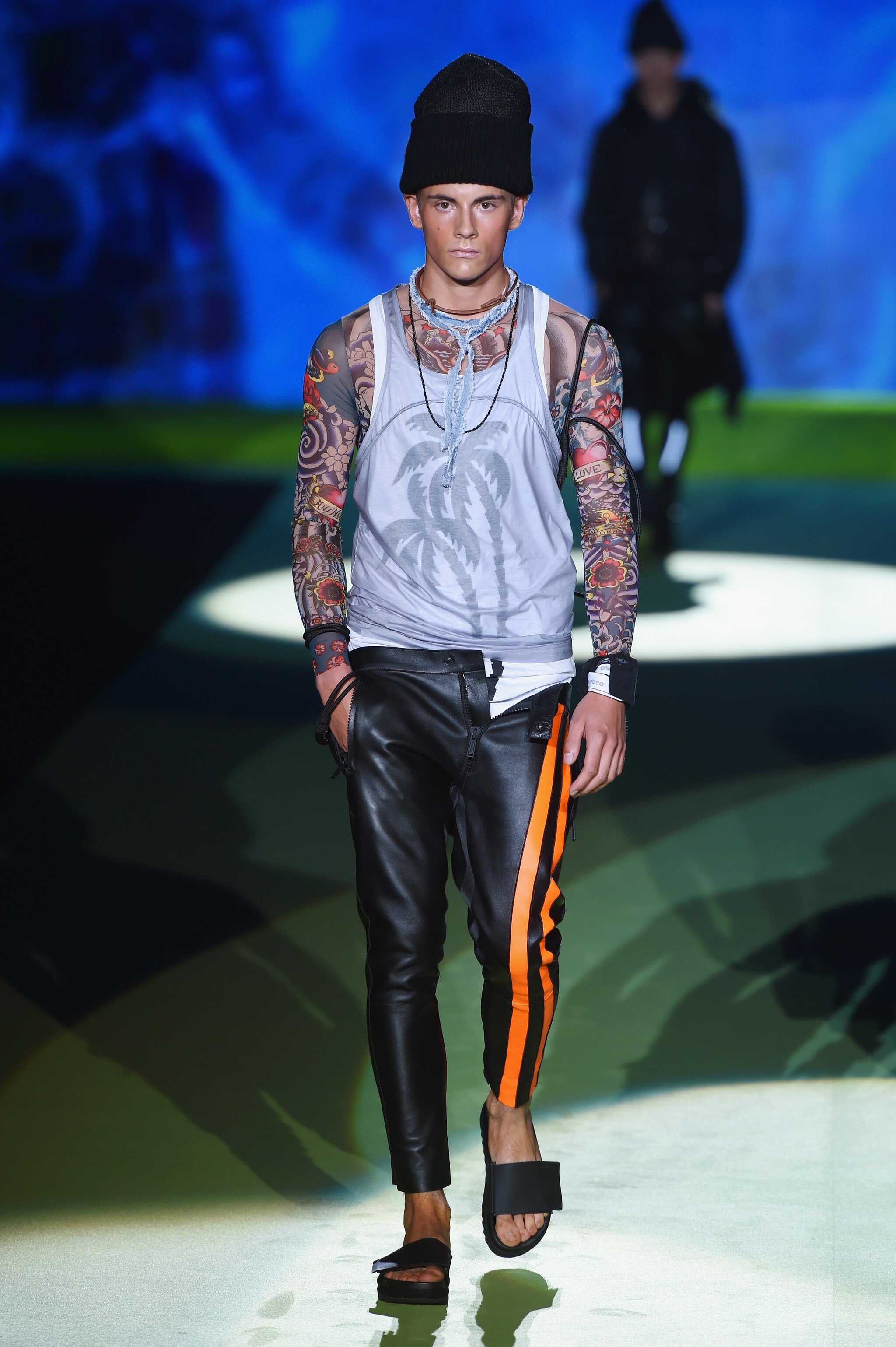 Nell'ultimo giorno di Milano Moda Uomo sfila la collezione primavera/Estate 2016 di Dsquared2. I gemelli Dean e Dan Caten portano in passerella un esercito di surfer tatuati che indossando canotte scollate, short dai colori accesi, cappelli voluminosi e completano il look con scarponcini da montagna e maxi zaini.