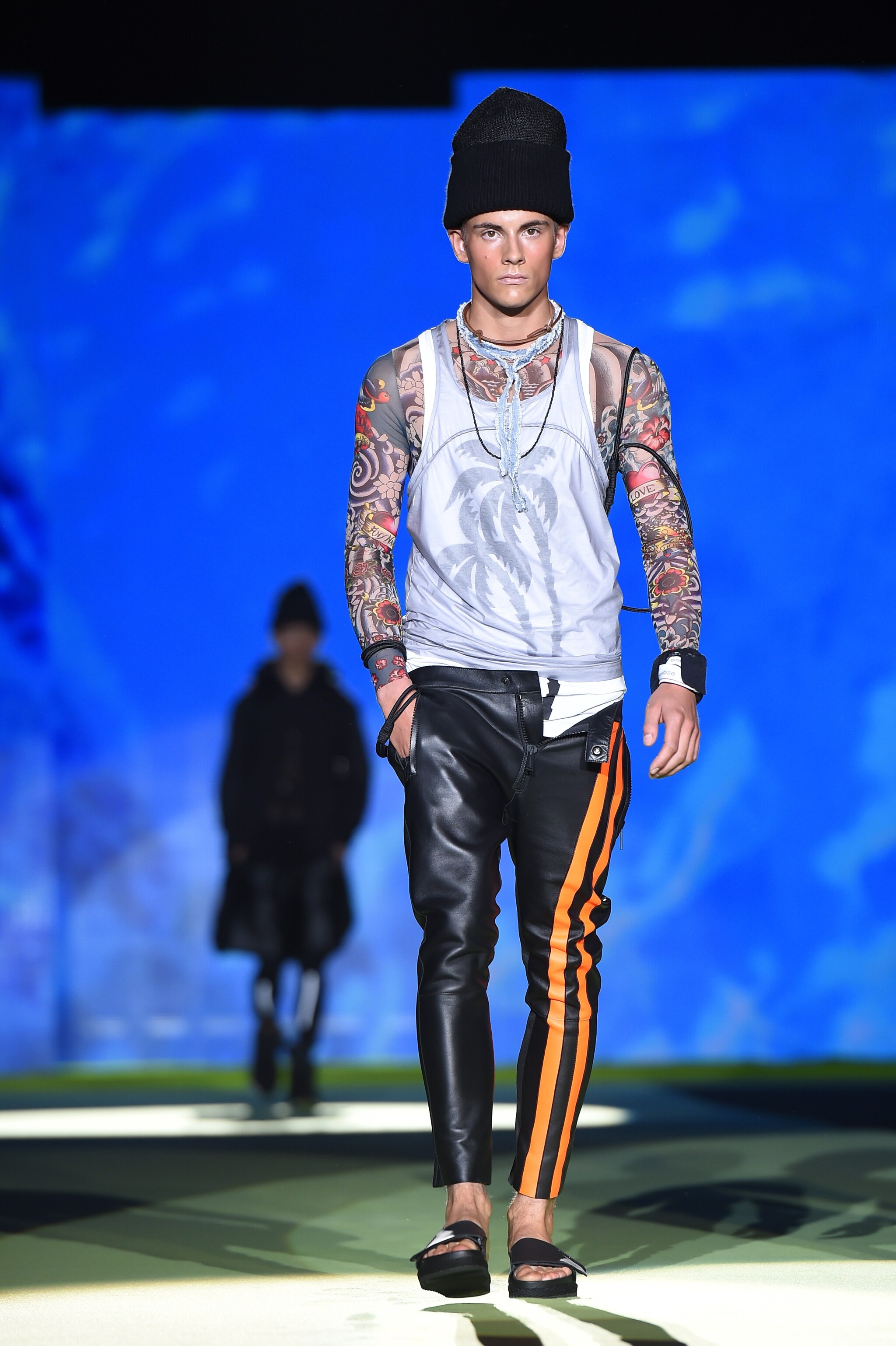 Nell'ultimo giorno di Milano Moda Uomo sfila la collezione primavera/Estate 2016 di Dsquared2. I gemelli Dean e Dan Caten portano in passerella un esercito di surfer tatuati che indossando canotte scollate, short dai colori accesi, cappelli voluminosi e completano il look con scarponcini da montagna e maxi zaini.
