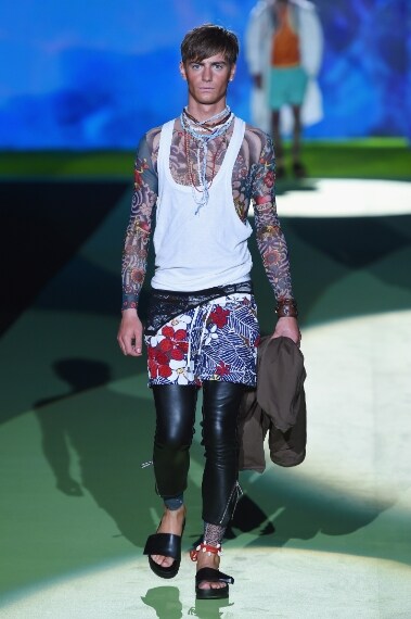 Nell'ultimo giorno di Milano Moda Uomo sfila la collezione primavera/Estate 2016 di Dsquared2. I gemelli Dean e Dan Caten portano in passerella un esercito di surfer tatuati che indossando canotte scollate, short dai colori accesi, cappelli voluminosi e completano il look con scarponcini da montagna e maxi zaini.