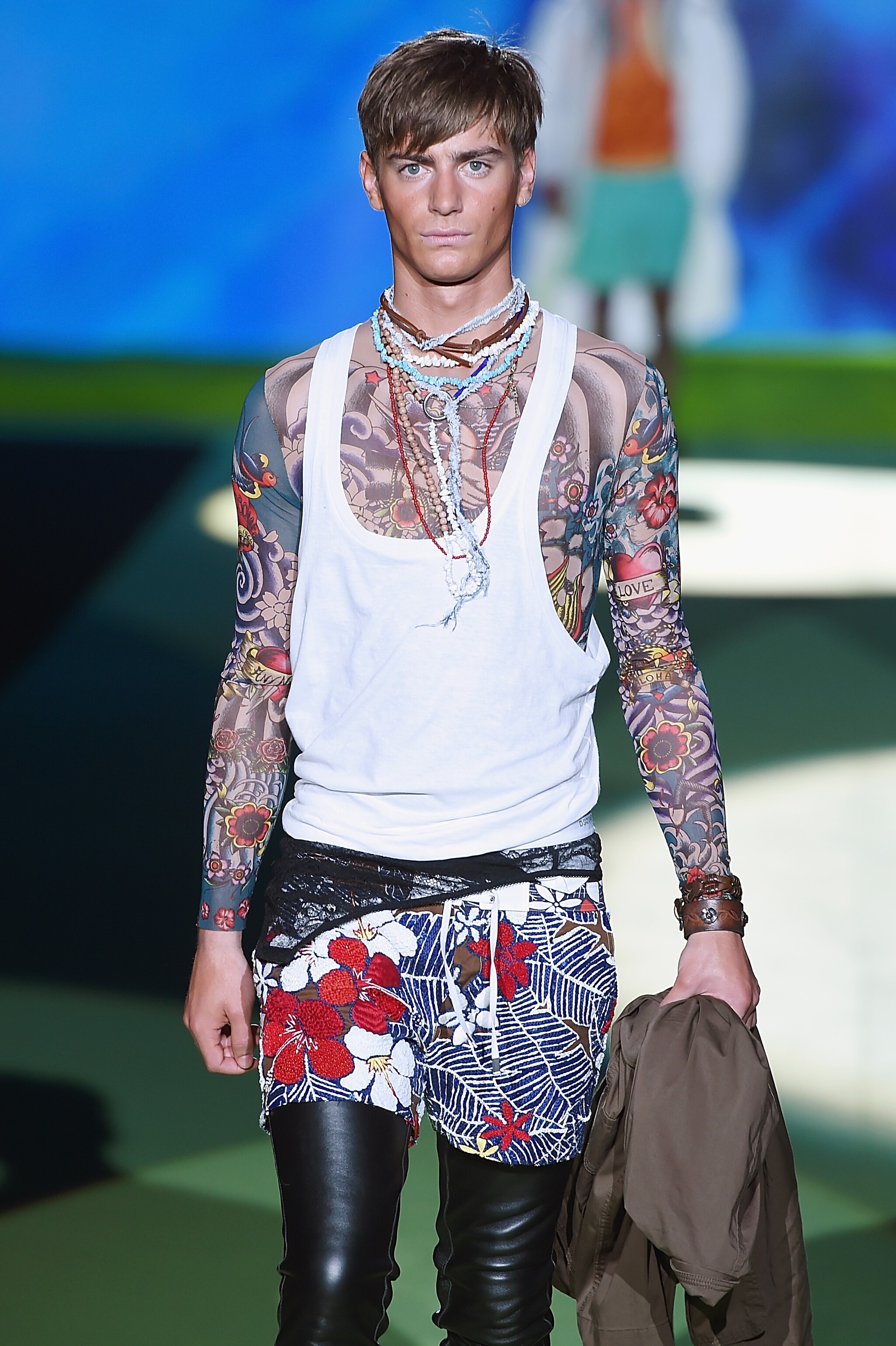 Nell'ultimo giorno di Milano Moda Uomo sfila la collezione primavera/Estate 2016 di Dsquared2. I gemelli Dean e Dan Caten portano in passerella un esercito di surfer tatuati che indossando canotte scollate, short dai colori accesi, cappelli voluminosi e completano il look con scarponcini da montagna e maxi zaini.