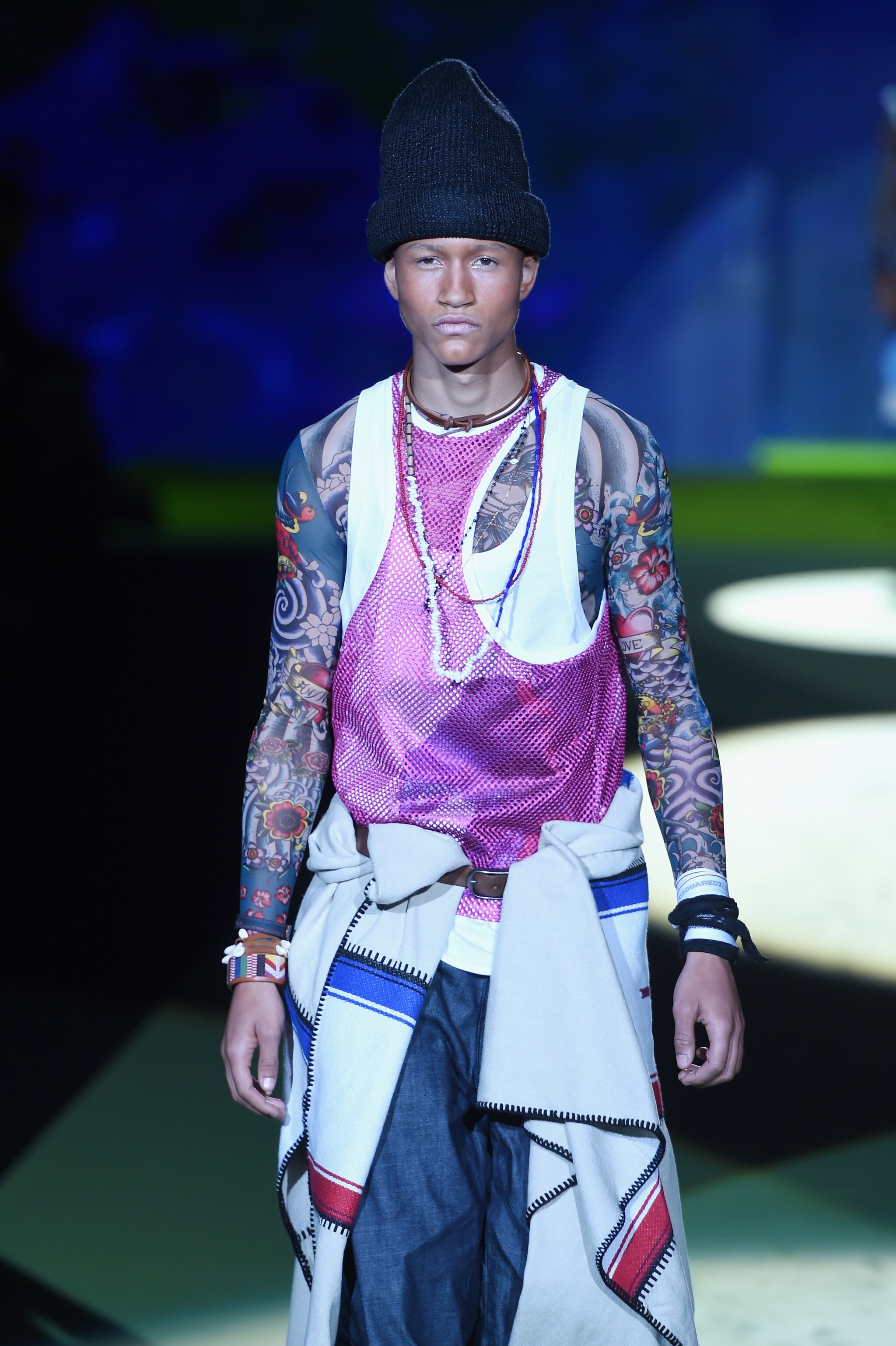 Nell'ultimo giorno di Milano Moda Uomo sfila la collezione primavera/Estate 2016 di Dsquared2. I gemelli Dean e Dan Caten portano in passerella un esercito di surfer tatuati che indossando canotte scollate, short dai colori accesi, cappelli voluminosi e completano il look con scarponcini da montagna e maxi zaini.