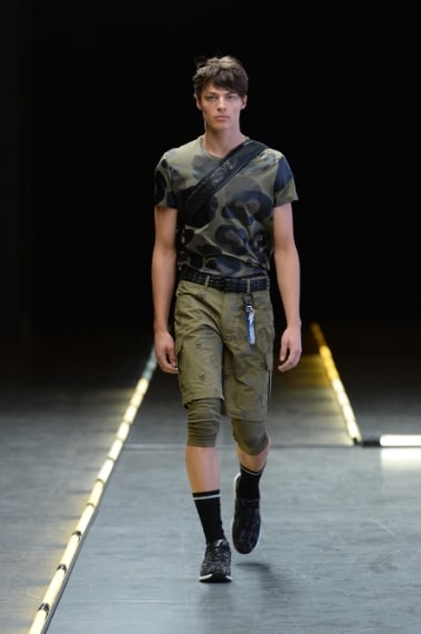 Ispirazioni derivanti dallo scenario punk, rock e rap della New York anni '80 rivivono nella collezione uomo per la Primavera/Estate 2016 di Hogan. In passerella sfilano shirt con "scarabocchi" fluo, giacche tuxedo e capi militari abbinati a sneakers, scarpe stampate, mocassini con nappine e maxi borse in pelle gommata.