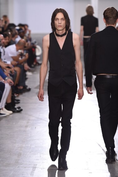 Linee pulite ed essenziali, look in total black intervallati da sprazzi di rosso intenso e blu acceso sfilano sulla passerella di CoSTUME NATIONAL alla Settimana della Moda di Milano. Ennio Capasa per la Primavera/Estate 2016 disegna un uomo "minimal-rock" che indossa pantaloni skinny e occhiali scuri, morbide camicie in seta e collari per completare il look.