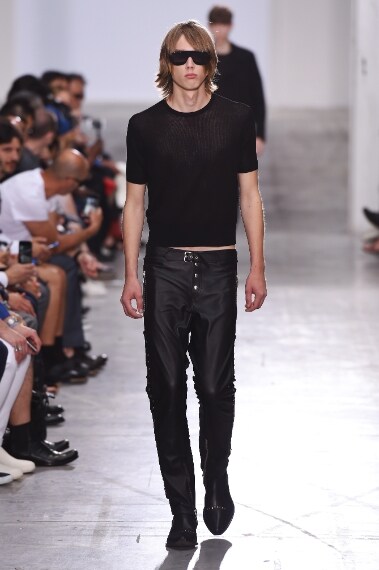 Linee pulite ed essenziali, look in total black intervallati da sprazzi di rosso intenso e blu acceso sfilano sulla passerella di CoSTUME NATIONAL alla Settimana della Moda di Milano. Ennio Capasa per la Primavera/Estate 2016 disegna un uomo "minimal-rock" che indossa pantaloni skinny e occhiali scuri, morbide camicie in seta e collari per completare il look.