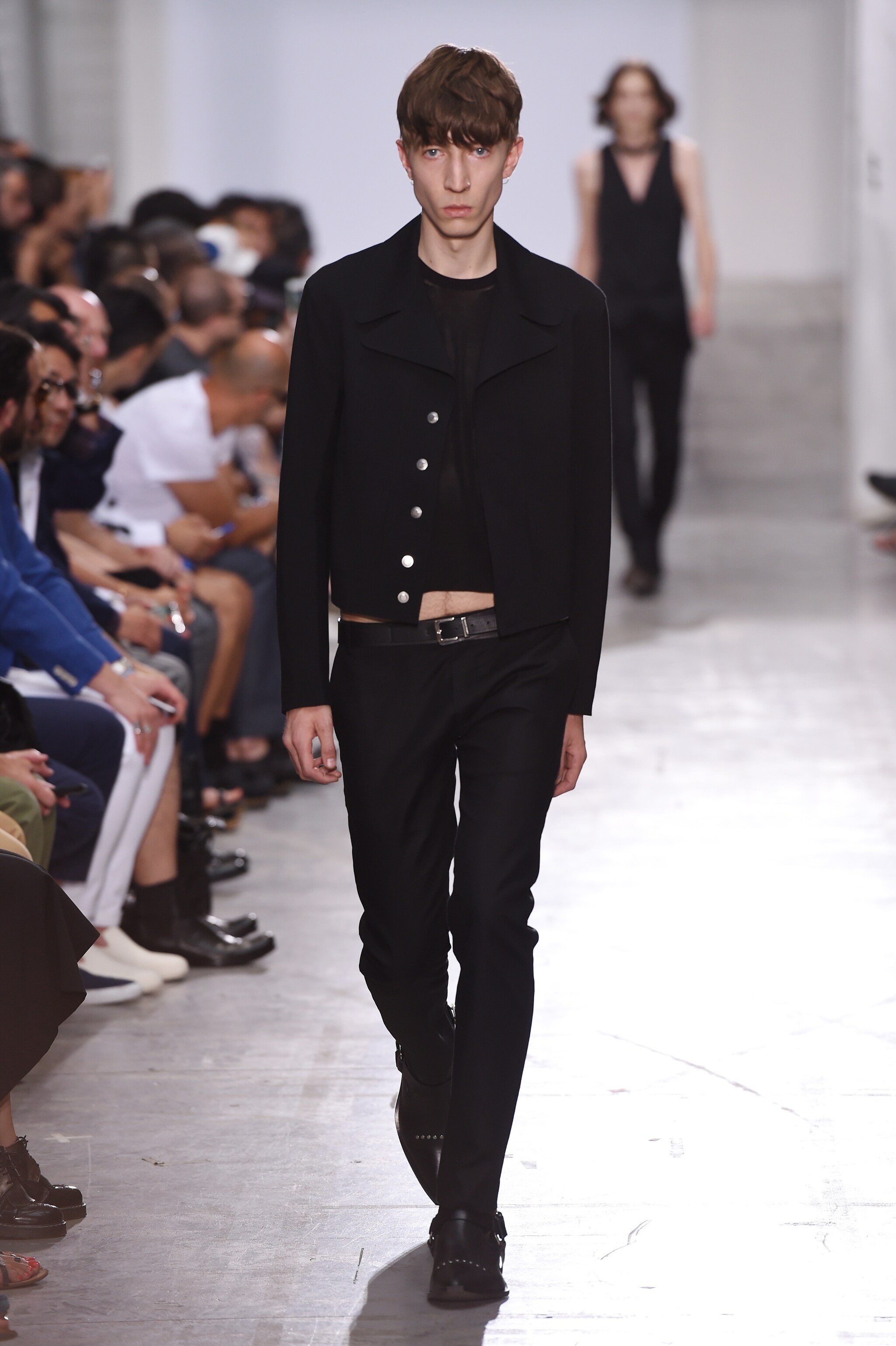 Linee pulite ed essenziali, look in total black intervallati da sprazzi di rosso intenso e blu acceso sfilano sulla passerella di CoSTUME NATIONAL alla Settimana della Moda di Milano. Ennio Capasa per la Primavera/Estate 2016 disegna un uomo "minimal-rock" che indossa pantaloni skinny e occhiali scuri, morbide camicie in seta e collari per completare il look.