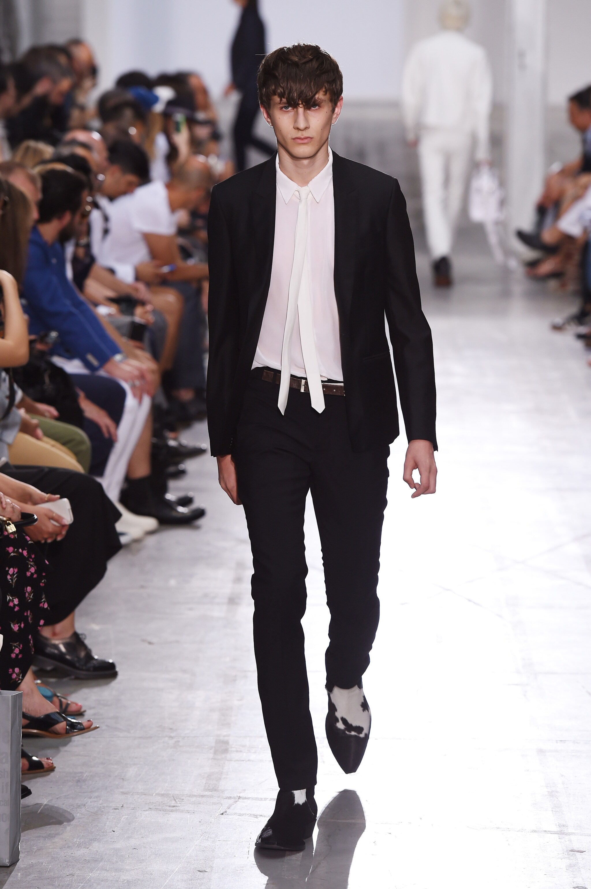 Linee pulite ed essenziali, look in total black intervallati da sprazzi di rosso intenso e blu acceso sfilano sulla passerella di CoSTUME NATIONAL alla Settimana della Moda di Milano. Ennio Capasa per la Primavera/Estate 2016 disegna un uomo "minimal-rock" che indossa pantaloni skinny e occhiali scuri, morbide camicie in seta e collari per completare il look.