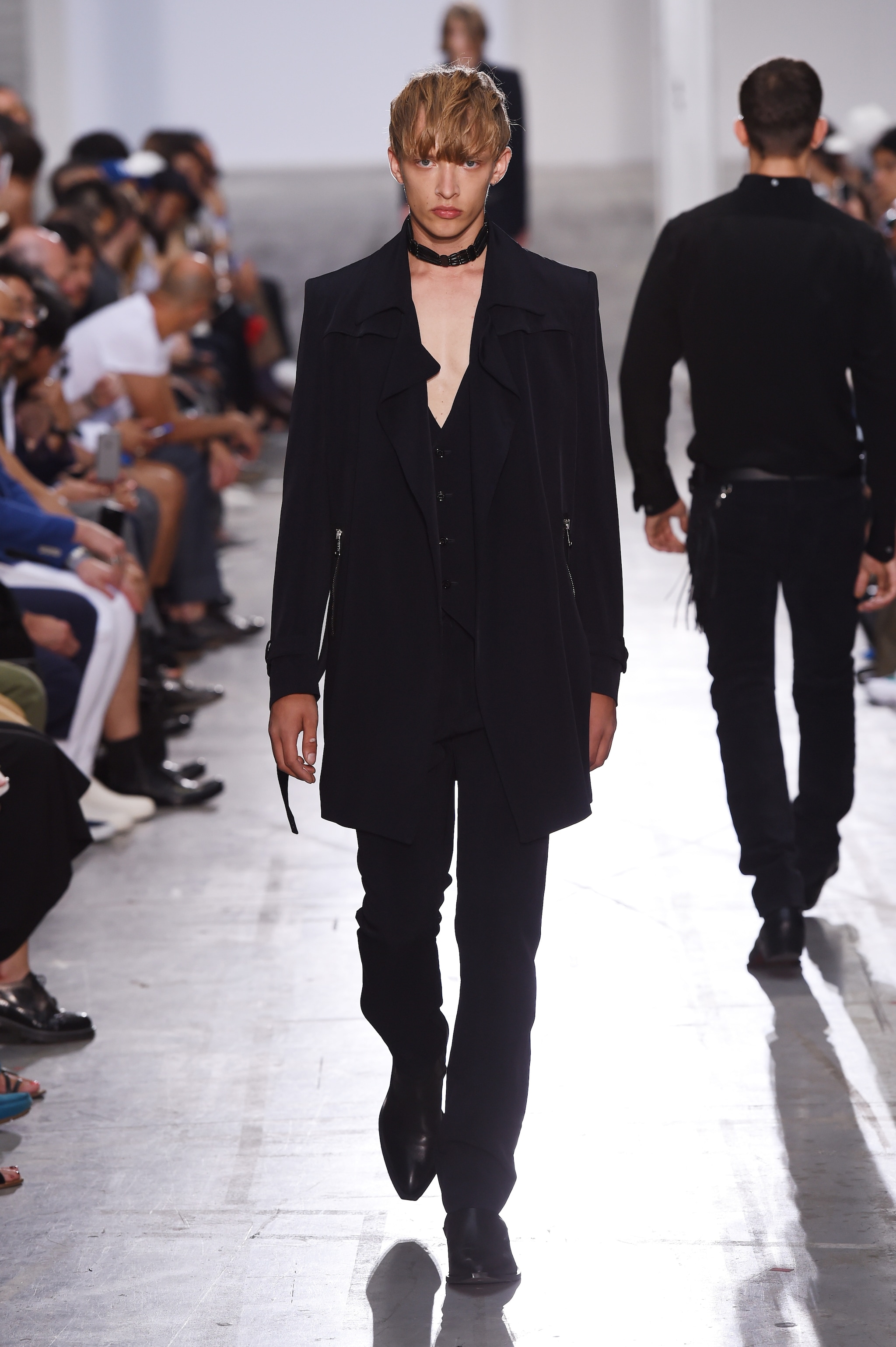 Linee pulite ed essenziali, look in total black intervallati da sprazzi di rosso intenso e blu acceso sfilano sulla passerella di CoSTUME NATIONAL alla Settimana della Moda di Milano. Ennio Capasa per la Primavera/Estate 2016 disegna un uomo "minimal-rock" che indossa pantaloni skinny e occhiali scuri, morbide camicie in seta e collari per completare il look.