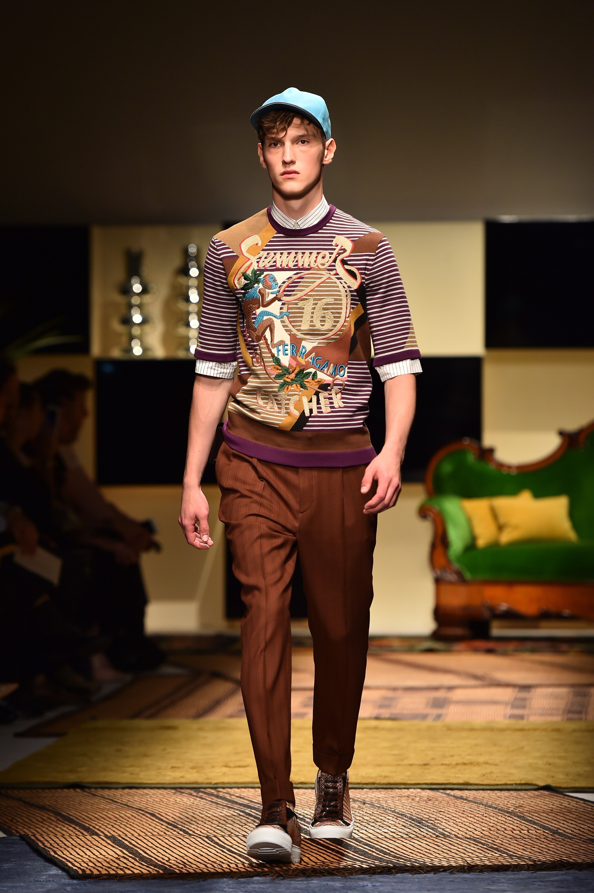 L'eleganza dell'alta sartoria si mescola con elementi pop nella collezione Primavera/Estate 2016 presentata dalla Maison Salvatore Ferragamo durante Milano Moda Uomo. Massimiliano Giornetti, designer di Ferragamo, disegna lo stile di un uomo giovane e trendy che non rinuncia all'eleganza di capi evergreen ma ama indossare shirt e felpe decorate con lettering e grafismi iper colorati, cravatte slim, sandali e cappellini con visiera.