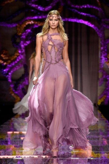 Alla settimana dell'Alta Moda di Parigi sfila la collezione Autunno/Inverno 2015-16 di Atelier Versace, linea Haute Couture della Maison della Medusa. Donatella Versace porta in passerella una "regina dei boschi" dall'animo hippie, vestita con leggiadri abiti dalle nuance romantiche, come il lilla e il rosa antico. La designer rende sensuale la donna con spacchi profondi e trasparenze, con corpetti rivelatori e profonde scollature, completando ogni look con grosse zeppe in vernice dal mood "seventies" e coroncine di fiori in stile hippie.