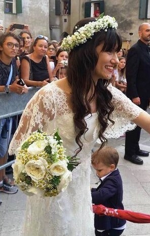 Per il giorno del matrimonio con Andrea Rigonat, Elisa Toffoli ha indossato un vestito da sposa della collezione Bridal Forever 2015 di Alberta Ferretti. Ecco il romantico abito di pizzo bianco dallo stile hippie chic scelto dalla cantante per le nozze