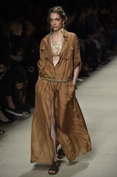 La collezione primaverile di Alberta Ferretti si ispira al deserto e alle sue dune, con colori caldi e linee morbide che avvolgono il corpo femminile. Marroni, ocra, senape e le sfumature della sabbia sono i colori protagonisti mentre per i tessuti la stilista ha scelto pizzi, chiffon, tulle e camosci.