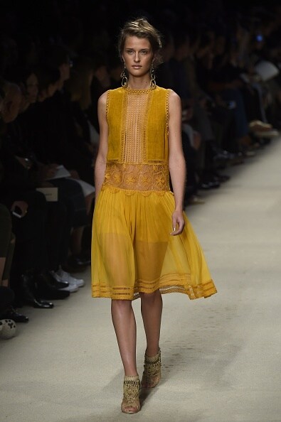 La collezione primaverile di Alberta Ferretti si ispira al deserto e alle sue dune, con colori caldi e linee morbide che avvolgono il corpo femminile. Marroni, ocra, senape e le sfumature della sabbia sono i colori protagonisti mentre per i tessuti la stilista ha scelto pizzi, chiffon, tulle e camosci.