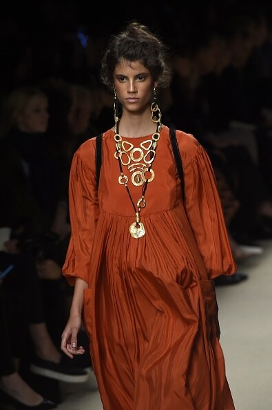 La collezione primaverile di Alberta Ferretti si ispira al deserto e alle sue dune, con colori caldi e linee morbide che avvolgono il corpo femminile. Marroni, ocra, senape e le sfumature della sabbia sono i colori protagonisti mentre per i tessuti la stilista ha scelto pizzi, chiffon, tulle e camosci.