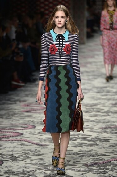 Colori vibranti e fantasie accattivanti sono stati al centro dell'attenzione sulla passerelle di Gucci: per la prossima primavera 2016 la maison ha scelto nuance come il verde, il celeste, l'arancione, ma anche il giallo, l'oro e ovviamente il nero, abbinati a tessuti classici come la seta, lo chiffon, il pizzo o più moderni come il lurex. Gucci soddisfa le esigenze di ogni donna, dal tailleur classico ai maxi abiti ispirati al mondo gipsy, dalle tuniche alle giacche in stile biker con tanto di borchie.