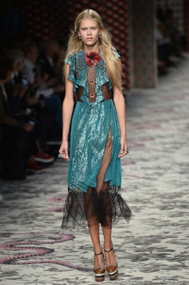 Colori vibranti e fantasie accattivanti sono stati al centro dell'attenzione sulla passerelle di Gucci: per la prossima primavera 2016 la maison ha scelto nuance come il verde, il celeste, l'arancione, ma anche il giallo, l'oro e ovviamente il nero, abbinati a tessuti classici come la seta, lo chiffon, il pizzo o più moderni come il lurex. Gucci soddisfa le esigenze di ogni donna, dal tailleur classico ai maxi abiti ispirati al mondo gipsy, dalle tuniche alle giacche in stile biker con tanto di borchie.