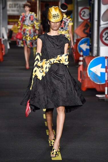 La passerella si trasforma in un cantiere stradale con tanto di segnaletica, coni arancioni e caschetti gialli. È l'effetto Moschino, che per la sua collezione ha voluto stupire tutti prendendo come ispirazione proprio i cantieri. Abiti e borse sono ricoperti da segnali stradali, i tubini sono profilati con tessuti catarinfrangenti. Outfit colorati e vivaci, tripudio di colori pop, frange, tutte e fluorescente rendono la collezione di Moschino divertente e frizzante.