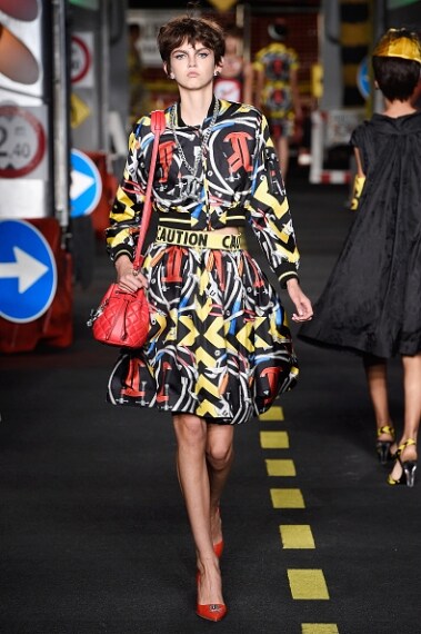 La passerella si trasforma in un cantiere stradale con tanto di segnaletica, coni arancioni e caschetti gialli. È l'effetto Moschino, che per la sua collezione ha voluto stupire tutti prendendo come ispirazione proprio i cantieri. Abiti e borse sono ricoperti da segnali stradali, i tubini sono profilati con tessuti catarinfrangenti. Outfit colorati e vivaci, tripudio di colori pop, frange, tutte e fluorescente rendono la collezione di Moschino divertente e frizzante.