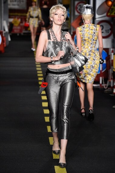 La passerella si trasforma in un cantiere stradale con tanto di segnaletica, coni arancioni e caschetti gialli. È l'effetto Moschino, che per la sua collezione ha voluto stupire tutti prendendo come ispirazione proprio i cantieri. Abiti e borse sono ricoperti da segnali stradali, i tubini sono profilati con tessuti catarinfrangenti. Outfit colorati e vivaci, tripudio di colori pop, frange, tutte e fluorescente rendono la collezione di Moschino divertente e frizzante.