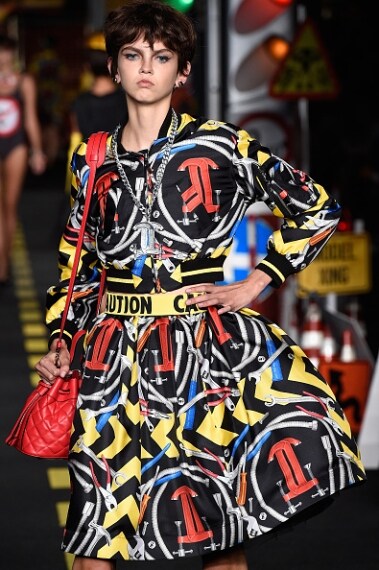 La passerella si trasforma in un cantiere stradale con tanto di segnaletica, coni arancioni e caschetti gialli. È l'effetto Moschino, che per la sua collezione ha voluto stupire tutti prendendo come ispirazione proprio i cantieri. Abiti e borse sono ricoperti da segnali stradali, i tubini sono profilati con tessuti catarinfrangenti. Outfit colorati e vivaci, tripudio di colori pop, frange, tutte e fluorescente rendono la collezione di Moschino divertente e frizzante.