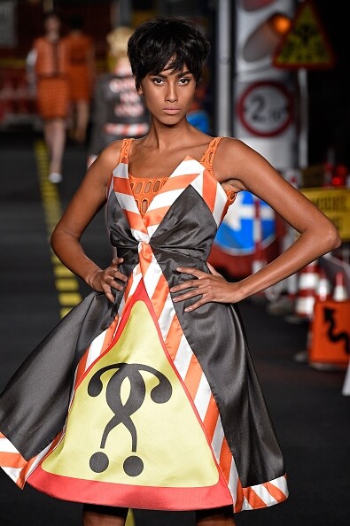 La passerella si trasforma in un cantiere stradale con tanto di segnaletica, coni arancioni e caschetti gialli. È l'effetto Moschino, che per la sua collezione ha voluto stupire tutti prendendo come ispirazione proprio i cantieri. Abiti e borse sono ricoperti da segnali stradali, i tubini sono profilati con tessuti catarinfrangenti. Outfit colorati e vivaci, tripudio di colori pop, frange, tutte e fluorescente rendono la collezione di Moschino divertente e frizzante.