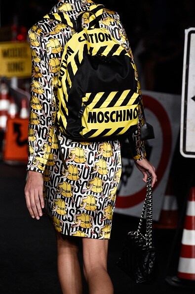 La passerella si trasforma in un cantiere stradale con tanto di segnaletica, coni arancioni e caschetti gialli. È l'effetto Moschino, che per la sua collezione ha voluto stupire tutti prendendo come ispirazione proprio i cantieri. Abiti e borse sono ricoperti da segnali stradali, i tubini sono profilati con tessuti catarinfrangenti. Outfit colorati e vivaci, tripudio di colori pop, frange, tutte e fluorescente rendono la collezione di Moschino divertente e frizzante.
