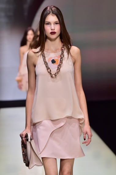 La donna di Emporio Armani è bon ton, elegante e sofisticata, vestita da tessuti morbidi e sinuosi nelle tonalità de rosa, del panna, del corallo e del cammello. Nuance delicate dalle sfumature pastello, trasparenze e pelle sono le protagoniste della collezione primaverile per il prossimo anno, con linee essenziali e pulite, perfette sia per la donna che vuole osare che per quella che preferisce la classicità di Re Giorgio.