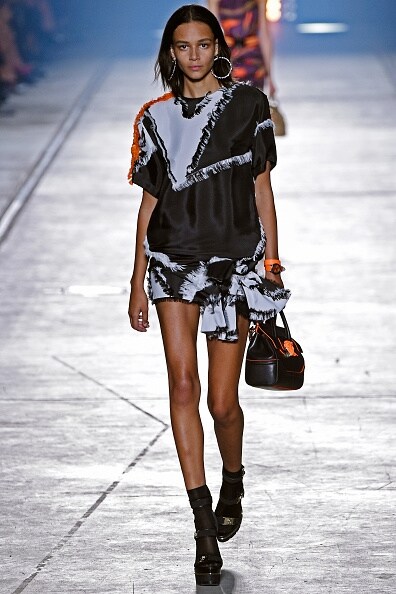 Un safari urban chic ha sfilato sulla passerella di Donatella Versace, dove animalier e look metropolitano si sono uniti a colori pop e stile elegante. Le nuance tipiche del safari come il cammello, il marrone, il verde kaki si sono unite a fucsia, giallo e verde acceso mixando stampe animalier con un tocco di eccentricità. Ai completi urban si affiancano quelli per la donna in carriera, con tailleur, minigonne e tubini.