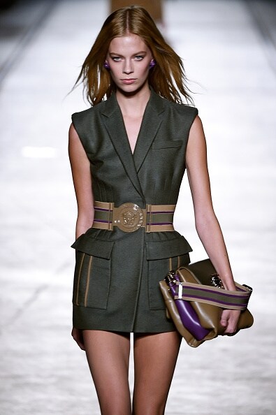 Un safari urban chic ha sfilato sulla passerella di Donatella Versace, dove animalier e look metropolitano si sono uniti a colori pop e stile elegante. Le nuance tipiche del safari come il cammello, il marrone, il verde kaki si sono unite a fucsia, giallo e verde acceso mixando stampe animalier con un tocco di eccentricità. Ai completi urban si affiancano quelli per la donna in carriera, con tailleur, minigonne e tubini.