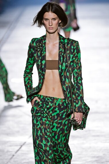 Un safari urban chic ha sfilato sulla passerella di Donatella Versace, dove animalier e look metropolitano si sono uniti a colori pop e stile elegante. Le nuance tipiche del safari come il cammello, il marrone, il verde kaki si sono unite a fucsia, giallo e verde acceso mixando stampe animalier con un tocco di eccentricità. Ai completi urban si affiancano quelli per la donna in carriera, con tailleur, minigonne e tubini.