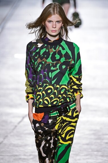 Un safari urban chic ha sfilato sulla passerella di Donatella Versace, dove animalier e look metropolitano si sono uniti a colori pop e stile elegante. Le nuance tipiche del safari come il cammello, il marrone, il verde kaki si sono unite a fucsia, giallo e verde acceso mixando stampe animalier con un tocco di eccentricità. Ai completi urban si affiancano quelli per la donna in carriera, con tailleur, minigonne e tubini.