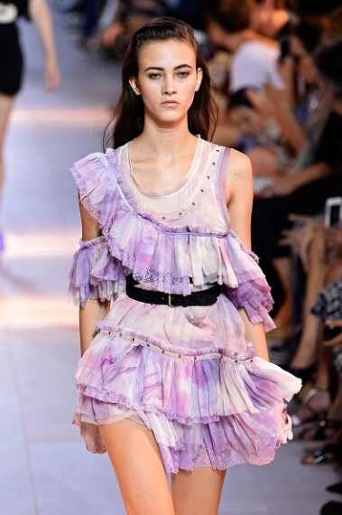 Peter Dundas torna da Roberto Cavalli e per il suo ritorno in passerella sceglie uno stile eccentrico ed elaborato, tipico della maison fiorentina. I richiami agli anni '80 con spalline max, chiodi in pelle e abiti dalla gonna asimmetrica si uniscono al rigore e al tocco sportivo del denim sbiancato. Uno stile sporty chic, con minidress, stampe animalier e tessuti i morbidi.