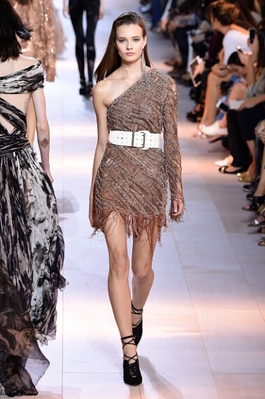 Peter Dundas torna da Roberto Cavalli e per il suo ritorno in passerella sceglie uno stile eccentrico ed elaborato, tipico della maison fiorentina. I richiami agli anni '80 con spalline max, chiodi in pelle e abiti dalla gonna asimmetrica si uniscono al rigore e al tocco sportivo del denim sbiancato. Uno stile sporty chic, con minidress, stampe animalier e tessuti i morbidi.