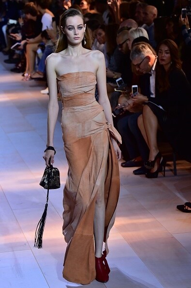 Peter Dundas torna da Roberto Cavalli e per il suo ritorno in passerella sceglie uno stile eccentrico ed elaborato, tipico della maison fiorentina. I richiami agli anni '80 con spalline max, chiodi in pelle e abiti dalla gonna asimmetrica si uniscono al rigore e al tocco sportivo del denim sbiancato. Uno stile sporty chic, con minidress, stampe animalier e tessuti i morbidi.