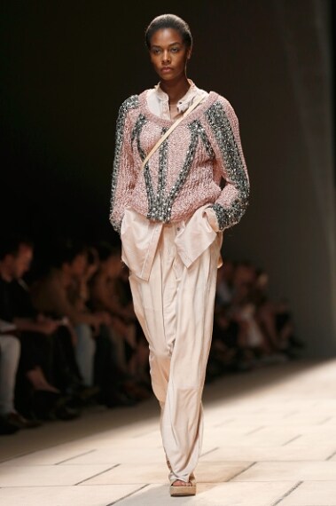 La donna di Trussardi è una viaggiatrice, vestita con volumi ampi e morbidi e tessuti che richiamo il mondo della natura. I colori protagonisti sono il sabbia, prevalente nella collezione primaverile, ma anche il marrone, l'arancione, il verde kaki e l'intramontabile bianco e nero. Le gonne sfiorano la caviglia così come i maxi dress, i tagli sono spesso asimmetrici, con spacchi e scollature.