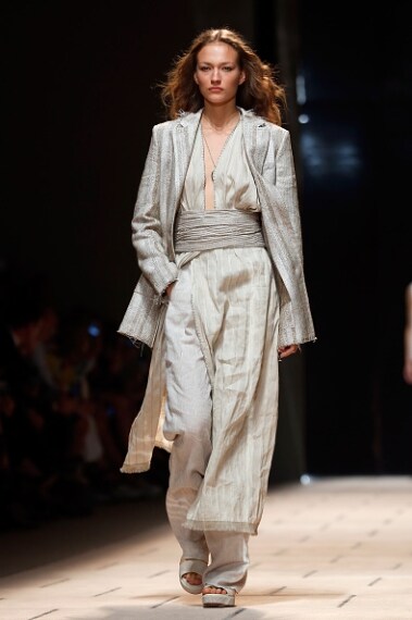 La donna di Trussardi è una viaggiatrice, vestita con volumi ampi e morbidi e tessuti che richiamo il mondo della natura. I colori protagonisti sono il sabbia, prevalente nella collezione primaverile, ma anche il marrone, l'arancione, il verde kaki e l'intramontabile bianco e nero. Le gonne sfiorano la caviglia così come i maxi dress, i tagli sono spesso asimmetrici, con spacchi e scollature.
