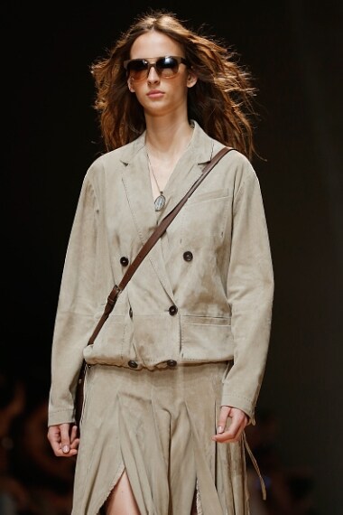 La donna di Trussardi è una viaggiatrice, vestita con volumi ampi e morbidi e tessuti che richiamo il mondo della natura. I colori protagonisti sono il sabbia, prevalente nella collezione primaverile, ma anche il marrone, l'arancione, il verde kaki e l'intramontabile bianco e nero. Le gonne sfiorano la caviglia così come i maxi dress, i tagli sono spesso asimmetrici, con spacchi e scollature.