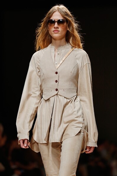 La donna di Trussardi è una viaggiatrice, vestita con volumi ampi e morbidi e tessuti che richiamo il mondo della natura. I colori protagonisti sono il sabbia, prevalente nella collezione primaverile, ma anche il marrone, l'arancione, il verde kaki e l'intramontabile bianco e nero. Le gonne sfiorano la caviglia così come i maxi dress, i tagli sono spesso asimmetrici, con spacchi e scollature.