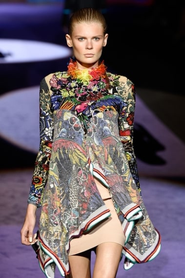 Sulla passerella sfila una collezione audace dai colori carioca e dalle forme accattivanti: è lo stile inconfondibile di DSquared2, estroso, frizzante ed eccentrico. Accostamenti color block, pellicce, fantasie tribali e top elasticizzati che creano una seconda pelle, ovviamente tatuata, in netto contrasto con l'outfit, dalle forme irregolari, lunghezze mini e gonne vaporose. Uno spettacolo a tutto colore, fatto di tessuti leggeri, trasparenze e sovrapposizioni che esaltano la sensualità femminile.