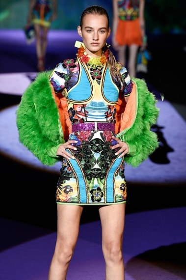 Sulla passerella sfila una collezione audace dai colori carioca e dalle forme accattivanti: è lo stile inconfondibile di DSquared2, estroso, frizzante ed eccentrico. Accostamenti color block, pellicce, fantasie tribali e top elasticizzati che creano una seconda pelle, ovviamente tatuata, in netto contrasto con l'outfit, dalle forme irregolari, lunghezze mini e gonne vaporose. Uno spettacolo a tutto colore, fatto di tessuti leggeri, trasparenze e sovrapposizioni che esaltano la sensualità femminile.