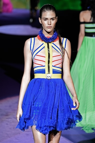 Sulla passerella sfila una collezione audace dai colori carioca e dalle forme accattivanti: è lo stile inconfondibile di DSquared2, estroso, frizzante ed eccentrico. Accostamenti color block, pellicce, fantasie tribali e top elasticizzati che creano una seconda pelle, ovviamente tatuata, in netto contrasto con l'outfit, dalle forme irregolari, lunghezze mini e gonne vaporose. Uno spettacolo a tutto colore, fatto di tessuti leggeri, trasparenze e sovrapposizioni che esaltano la sensualità femminile.