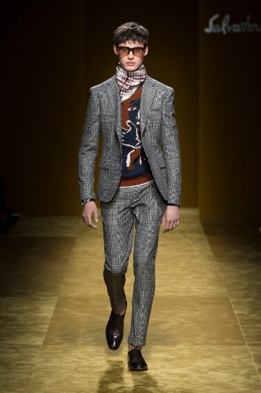 E' un uomo elegante e sicuro, classico e moderno, forte ma con un animo gentile quello che sfila sulla passerella Autunno/Inverno 2016- 2017 di Salvatore Ferragamo. Massimiliano Giornetti, art director della storica Maison italiana, disegna una splendida collezione in cui capi senza tempo, come il camel coat e il classico abito check doppiopetto, convivono con pezzi di tendenza, come il bomber o come originali pullover con decori ispirati ad opere d'arte moderna, in un continuo rimando tra passato e presente, in cui gli opposti creano lo stile perfetto dell'uomo del futuro.