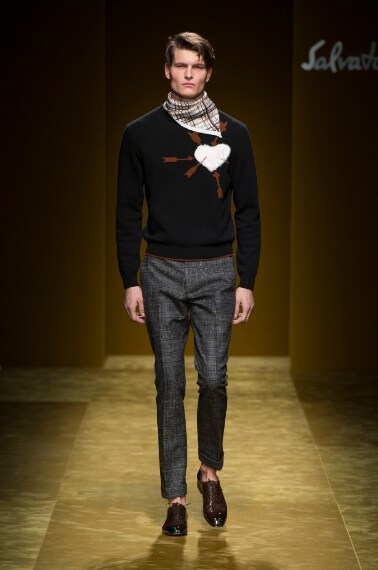 E' un uomo elegante e sicuro, classico e moderno, forte ma con un animo gentile quello che sfila sulla passerella Autunno/Inverno 2016- 2017 di Salvatore Ferragamo. Massimiliano Giornetti, art director della storica Maison italiana, disegna una splendida collezione in cui capi senza tempo, come il camel coat e il classico abito check doppiopetto, convivono con pezzi di tendenza, come il bomber o come originali pullover con decori ispirati ad opere d'arte moderna, in un continuo rimando tra passato e presente, in cui gli opposti creano lo stile perfetto dell'uomo del futuro.