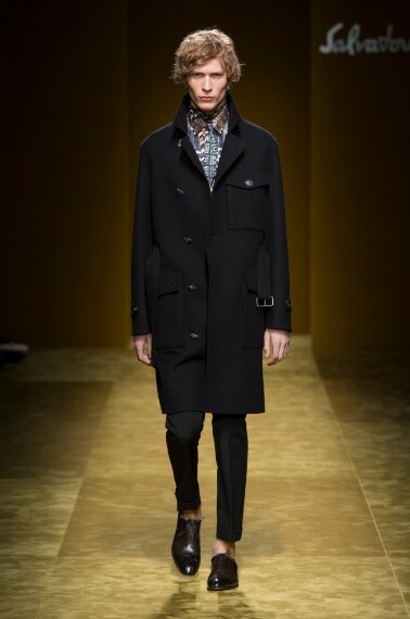 E' un uomo elegante e sicuro, classico e moderno, forte ma con un animo gentile quello che sfila sulla passerella Autunno/Inverno 2016- 2017 di Salvatore Ferragamo. Massimiliano Giornetti, art director della storica Maison italiana, disegna una splendida collezione in cui capi senza tempo, come il camel coat e il classico abito check doppiopetto, convivono con pezzi di tendenza, come il bomber o come originali pullover con decori ispirati ad opere d'arte moderna, in un continuo rimando tra passato e presente, in cui gli opposti creano lo stile perfetto dell'uomo del futuro.