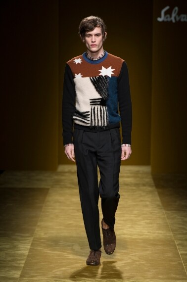 E' un uomo elegante e sicuro, classico e moderno, forte ma con un animo gentile quello che sfila sulla passerella Autunno/Inverno 2016- 2017 di Salvatore Ferragamo. Massimiliano Giornetti, art director della storica Maison italiana, disegna una splendida collezione in cui capi senza tempo, come il camel coat e il classico abito check doppiopetto, convivono con pezzi di tendenza, come il bomber o come originali pullover con decori ispirati ad opere d'arte moderna, in un continuo rimando tra passato e presente, in cui gli opposti creano lo stile perfetto dell'uomo del futuro.