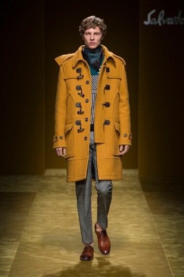 E' un uomo elegante e sicuro, classico e moderno, forte ma con un animo gentile quello che sfila sulla passerella Autunno/Inverno 2016- 2017 di Salvatore Ferragamo. Massimiliano Giornetti, art director della storica Maison italiana, disegna una splendida collezione in cui capi senza tempo, come il camel coat e il classico abito check doppiopetto, convivono con pezzi di tendenza, come il bomber o come originali pullover con decori ispirati ad opere d'arte moderna, in un continuo rimando tra passato e presente, in cui gli opposti creano lo stile perfetto dell'uomo del futuro.