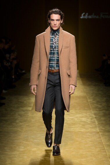 E' un uomo elegante e sicuro, classico e moderno, forte ma con un animo gentile quello che sfila sulla passerella Autunno/Inverno 2016- 2017 di Salvatore Ferragamo. Massimiliano Giornetti, art director della storica Maison italiana, disegna una splendida collezione in cui capi senza tempo, come il camel coat e il classico abito check doppiopetto, convivono con pezzi di tendenza, come il bomber o come originali pullover con decori ispirati ad opere d'arte moderna, in un continuo rimando tra passato e presente, in cui gli opposti creano lo stile perfetto dell'uomo del futuro.