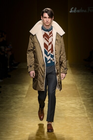 E' un uomo elegante e sicuro, classico e moderno, forte ma con un animo gentile quello che sfila sulla passerella Autunno/Inverno 2016- 2017 di Salvatore Ferragamo. Massimiliano Giornetti, art director della storica Maison italiana, disegna una splendida collezione in cui capi senza tempo, come il camel coat e il classico abito check doppiopetto, convivono con pezzi di tendenza, come il bomber o come originali pullover con decori ispirati ad opere d'arte moderna, in un continuo rimando tra passato e presente, in cui gli opposti creano lo stile perfetto dell'uomo del futuro.