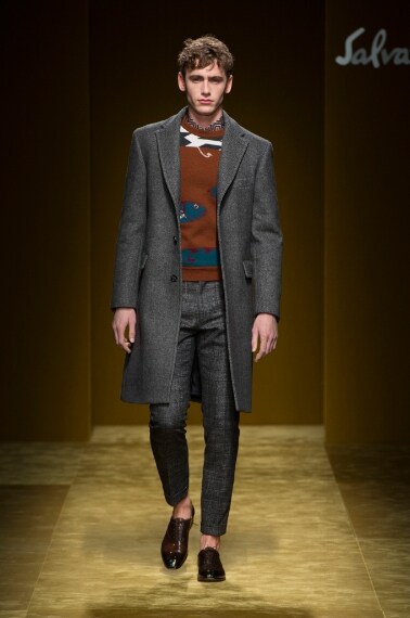 E' un uomo elegante e sicuro, classico e moderno, forte ma con un animo gentile quello che sfila sulla passerella Autunno/Inverno 2016- 2017 di Salvatore Ferragamo. Massimiliano Giornetti, art director della storica Maison italiana, disegna una splendida collezione in cui capi senza tempo, come il camel coat e il classico abito check doppiopetto, convivono con pezzi di tendenza, come il bomber o come originali pullover con decori ispirati ad opere d'arte moderna, in un continuo rimando tra passato e presente, in cui gli opposti creano lo stile perfetto dell'uomo del futuro.