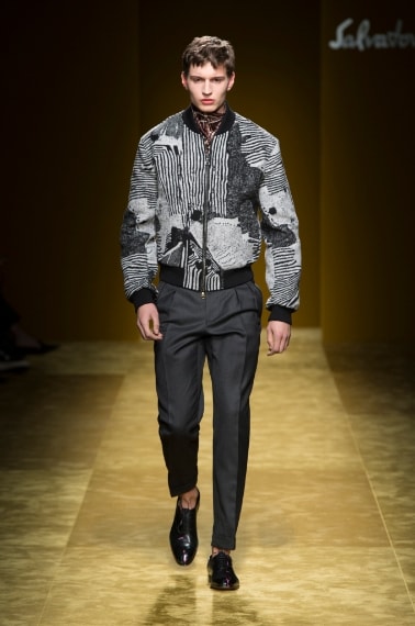 E' un uomo elegante e sicuro, classico e moderno, forte ma con un animo gentile quello che sfila sulla passerella Autunno/Inverno 2016- 2017 di Salvatore Ferragamo. Massimiliano Giornetti, art director della storica Maison italiana, disegna una splendida collezione in cui capi senza tempo, come il camel coat e il classico abito check doppiopetto, convivono con pezzi di tendenza, come il bomber o come originali pullover con decori ispirati ad opere d'arte moderna, in un continuo rimando tra passato e presente, in cui gli opposti creano lo stile perfetto dell'uomo del futuro.