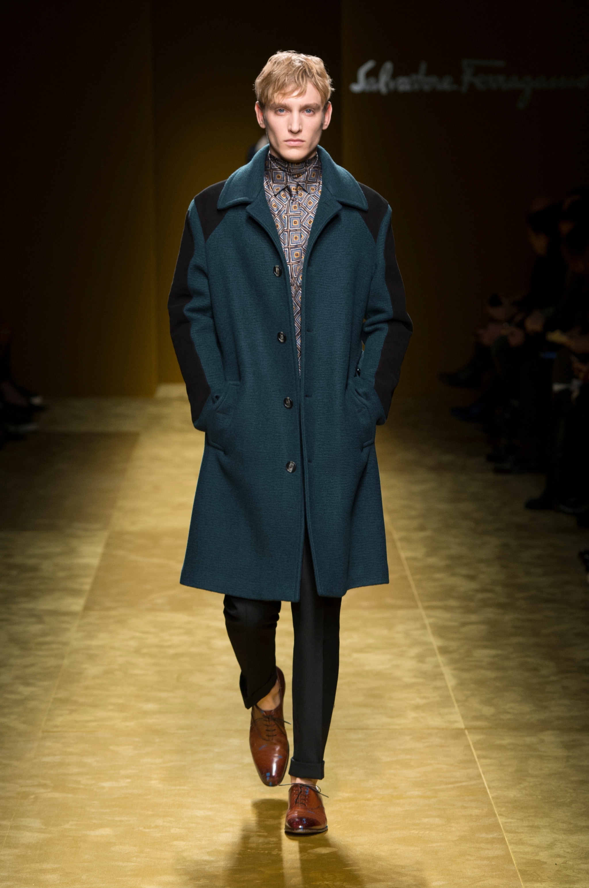E' un uomo elegante e sicuro, classico e moderno, forte ma con un animo gentile quello che sfila sulla passerella Autunno/Inverno 2016- 2017 di Salvatore Ferragamo. Massimiliano Giornetti, art director della storica Maison italiana, disegna una splendida collezione in cui capi senza tempo, come il camel coat e il classico abito check doppiopetto, convivono con pezzi di tendenza, come il bomber o come originali pullover con decori ispirati ad opere d'arte moderna, in un continuo rimando tra passato e presente, in cui gli opposti creano lo stile perfetto dell'uomo del futuro.